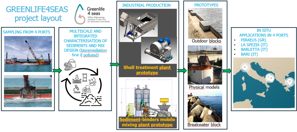 These innovative mixtures of sediments, cement and shell powders form the basis for a new generation of construction materials. Within GREENLIFE4SEAS, these materials will be further optimised and transformed into industrial prototypes of breakwaters, outdoor pavements and port-quay models. Thanks to collaboration with SIMEM S.p.A. and Vitone Eco Srl, and the strategic support of Noesis European Development Consulting, the prototypes will be produced using dedicated plants and mobile facilities capable of operating directly in the ports of Bari, Barletta, La Spezia and Piraeus. In this way, the project closes the loop between the place of sediment origin, transformation and reuse, drastically reducing transport, costs and environmental impacts.